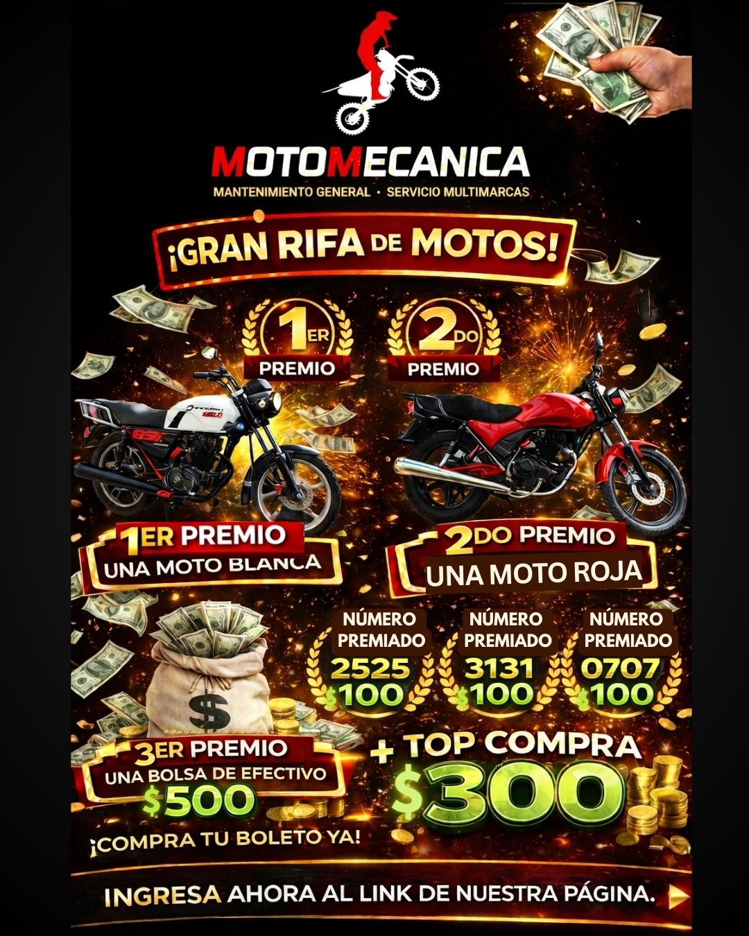 MotoMecánica y MotoRepuesto presentan su Gran Rifa, creada para premiar a nuestros clientes y seguidores con increíbles premios.
